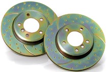 Die Reibfläche der Turbo Groove Sportbremsscheibe ist genutet und geschlitzt. So werden alle Vorteile einer gebohrten Sportbremsscheibe erreicht, jedoch ohne die Gefahr der allseits bekannten Hitzerisse bei komplett durchgebohrten Bremsscheiben einzugehen. Die Turbo Groove Disc ist goldfarben beschichtet um einen Korrosionsschutz zu gewährleisten. Aufgrund der hohen Qualitätsanforderungen, die an die Produkte gestellt werden, werden alle EBC Bremsscheiben vor der endgültigen Marktfreigabe gewuchtet und auf einen eventuellen Seitenschlag geprüft. Ein Großteil der Sportbremsscheiben wird mit ABE ausgeliefert.